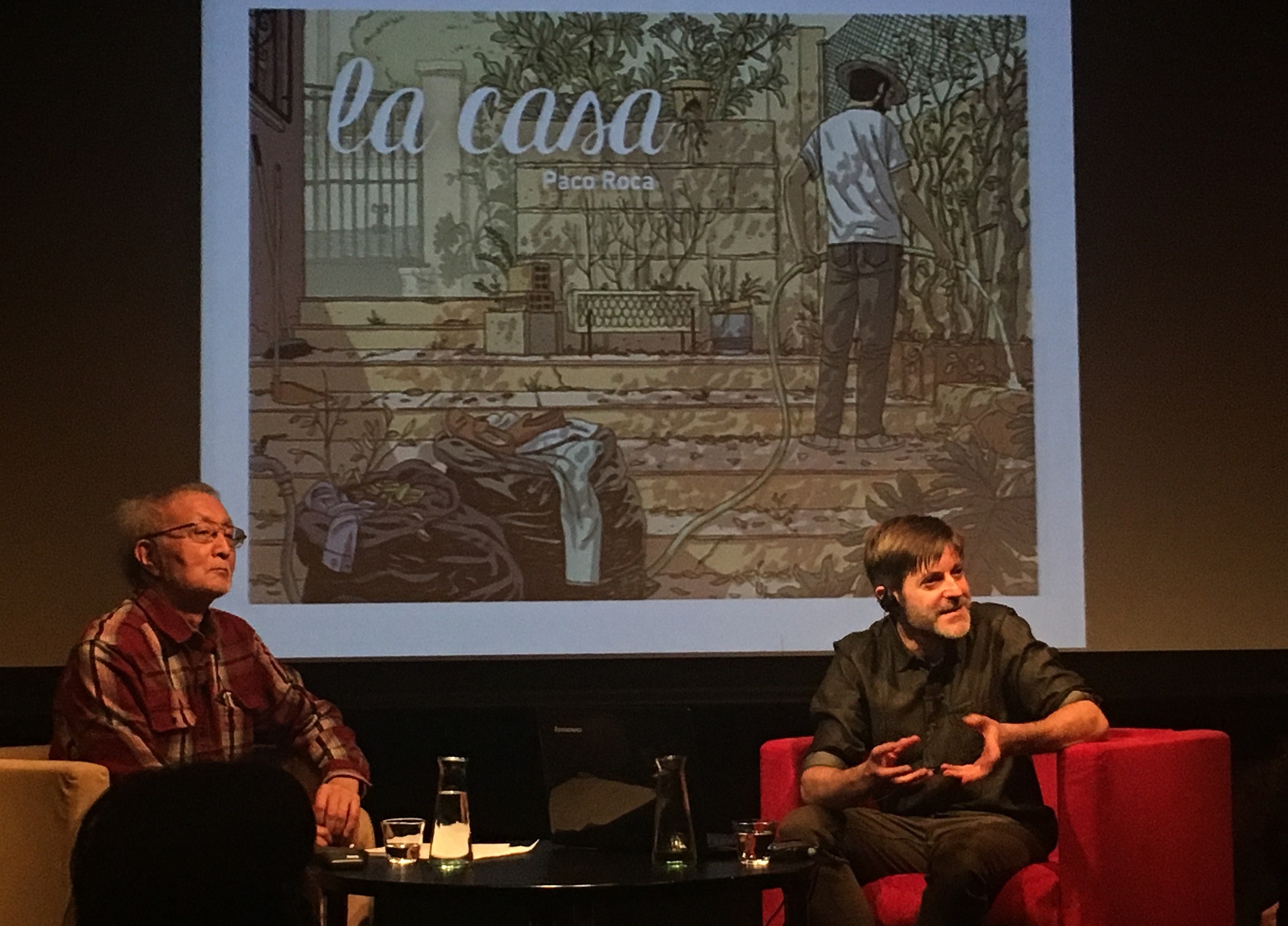 スペインの売れっ子マンガ家パコ・ロカ氏。認知症を主題にしたコミック『皺(しわ)』は2012年に日本語に訳され、文化庁メディア芸術祭マンガ部門で優秀賞を受賞しました。この作品はスペインでアニメーション映画化され、日本では三鷹の森ジブリ美術館のライブラリー作品として配給・上映されて話題に。今年、その続編ともいえるコミック『家』の邦訳出版を記念し、またロカ氏原作の新しいアニメーション映画『パジャマを着た男の記憶』が東京アニメアワードフェスティバルのオープニングを飾るのを機に、5年ぶりに来日しました。インスティトゥト・セルバンテスで開催された海外コミック評論家小野耕世氏との対談で、ロカ氏が語った自作やコミック市場の変化に関するお話を紹介します。